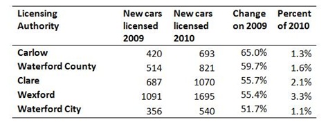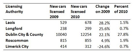 Although in the bottom five, the increase of 2,214 in new passenger car licenses in Dublin City and County is greater than the combined increase of 1,751 recorded for the top five licensing areas in the first table.