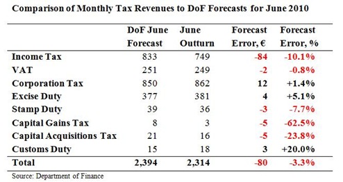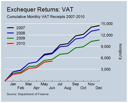 The information note published with the returns may suggest that the Minister is relatively satisfied with the Department's forecasts and that “Budget Day targets remain valid”. However, after almost coming in on target in April (only 0.1% below target) the gap between cumulative tax revenues for 2010 and the Department’s forecasts of same has been widening. It was 1.2% in May and was 1.5% in June. And remember these are targets that already forecast a 6% drop in the annual tax take.