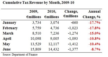 Most of the mainstream commentary focused on €227 million or 1.6% shortfall relative to the Department of Finance forecasts. This is only a small part of the picture. What is of more interest is the performance of tax revenues in the first six months of 2010 relative to the same period in 2009.