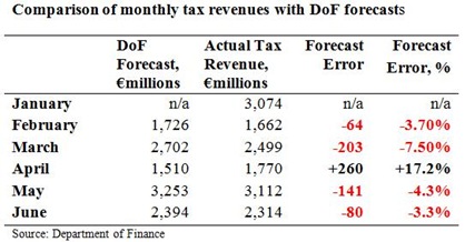 The Department of Finance had been predicting a slightly better June, and tax revenue came in €80 million or 3.3% below the Department’s June forecast. However, this was actually the best of the Department’s forecasts of the year so far.