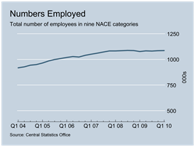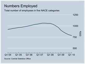The most recent Quarterly National Household Survey (QNHS) for Q1 2010 tells us that Economy One had actually added a small number of jobs with total employment standing at 1,086,000, an increase of some 3,400 jobs. On the other hand Economy Two has seen employment destruction on a vast scale with 271,300 jobs lost or 25.7% of the total, bringing the numbers employed down to 783,800.