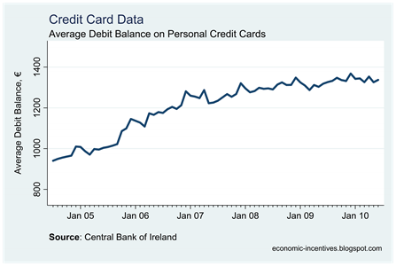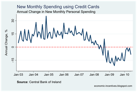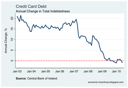 Up until the beginning of 2007 the annual growth rate was consistently above 15%. Since then it quickly collapsed and has oscillated around zero for the past 16 months. The total credit card debt for June 2010 (€2,995 million) is less than the total debt for June 2008 (€3,001 million).