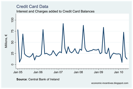 The peaks that approach €80 million correspond to April of each year when the annual government duty of €30 (previously €40) on credit cards is due. Since January 2008 about €960 million has been added to credit card balances through interest and charges.