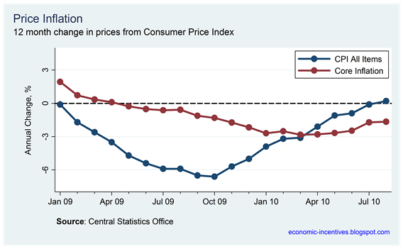 The headline figure of inflation may have turned positive and the 0.7% increase in prices in August may have been the largest monthly increase in prices going back 27 months to May 2008 but it is still too early that consumer prices in general are rising. Of the 0.7% increase in prices recorded in August, the increases in mortgage interest contributed 0.56% of the increase. Prices in all other categories were largely unchanged. It is still a bit early to be singing inflation once again. Tweet
