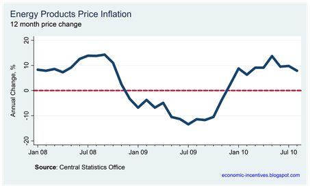 Energy prices are up largely because of increases in excise duty through the introduction of the carbon tax. This was added to the price of petrol and diesel last December and to the prices of other fuels from the first of May this year. These are not part of the general price trend in the overall economy.