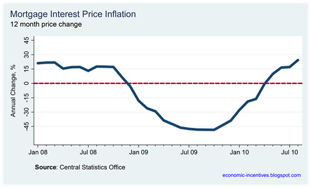 Mortgage interest is up because our ailing banks are jacking up variable rate mortgages in a bid to raise revenue and offset some of their loss-making tracker rate mortgages. The huge variation in mortgage interest inflation can be seen here. In August last rate the annual change was –48.4%. This year there has been an annual increase of 24.4%.