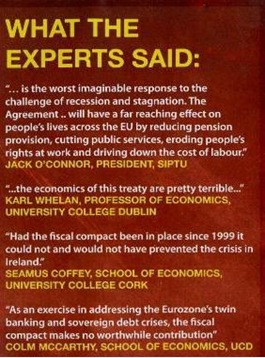 “If the Treaty is rejected we will be forced to adhere to the budgetary rules anyway but will be denied access the new European Stability Mechanism (ESM) bailout fund. We cannot avoid the fiscal rules in the Treaty. All in all there is little to be gained from rejecting the Treaty.”Again this quote is 100% accurate. This is extracted from the final paragraphs of a recent article I wrote for The Evening Echo.