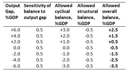 If should be clear that the allowed overall balances are counter-cyclical. When the economy is growing above its potential it is required to run overall surpluses, and in a downturn it is allowed to run deficits. In the case of a very large output gap of –4% of GDP it can be seen that the rule allows a deficit of 2.5% of GDP.